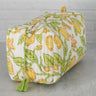 The cosmetic bags are constructed from a quilted block-printed cotton. The inside is lined with plastic for easy clean-up, with two handy pockets on one side. A pretty tassel is attached to the zipper.
