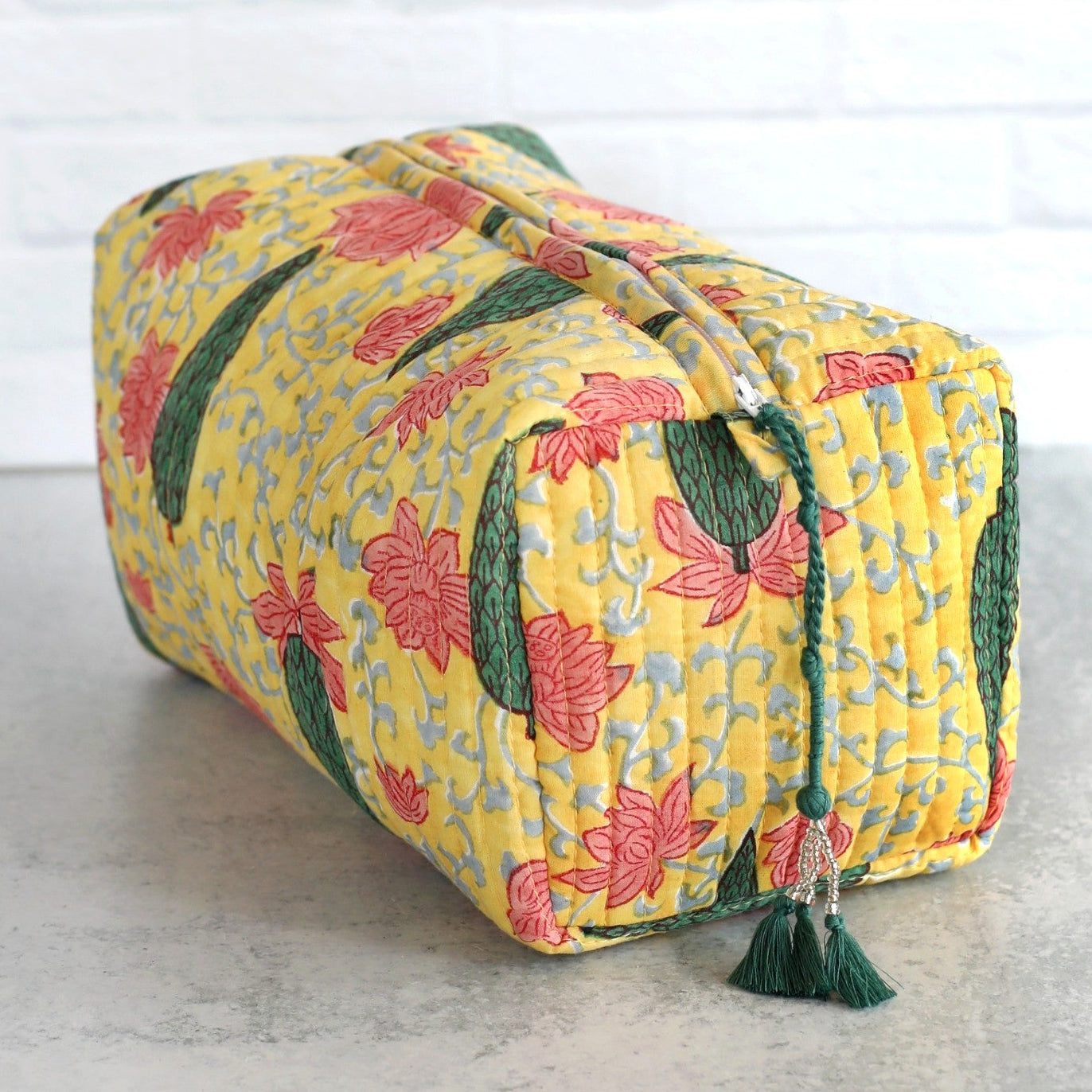 Keep your essentials beautifully organized with our Pacho Saffron cosmetic bags. Hand block printed on soft cotton with an Italian Cypress design in marigolds, teals and pinks, these bags are lined in plastic with two handy pockets for added convenience. Perfect for makeup, toiletries, or travel essentials, each zippered pouch blends everyday function with artisanal charm.