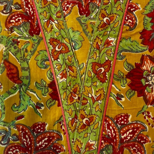 The rich color palette includes terracotta & wine flowers with green leaves and accents on a rich khaki background. Intricate contrasting border details at pockets, front opening, sleeve edges and belt.